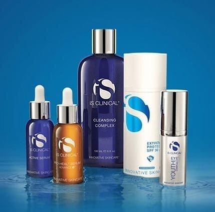 Products include iS Clinical cleansers, serums, moisturizers, eye and neck creams, and SPF formulas.